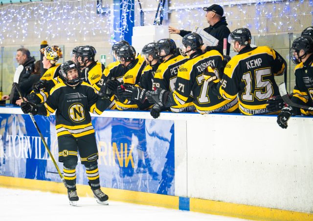 Nottingham were awarded a huge opportunity to claw their way back into the game at 54:28 as a double-minor was called on #8 Flynn Massie. The Lions’ top-points scorer, #27 Alex Rushby stepped up for his side and secured his hat-trick goal past #35 Luca Tessadri at 55:37 on the powerplay.